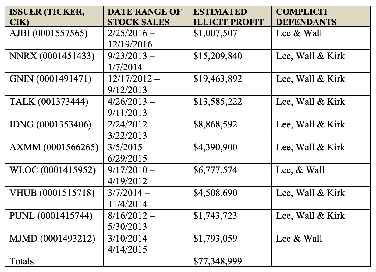 According to the SEC’s complaint, between at least 2011 and 2016, Jay Scott Kirk Lee, Geoffrey Allen Wall, and Benjamin Thompson Kirk allegedly were able to utilize a network of offshore front companies to conceal their control of shares in penny stocks, unload those shares on unsuspecting retail investors, and disburse the proceeds of their fraud to various bank accounts throughout the world.