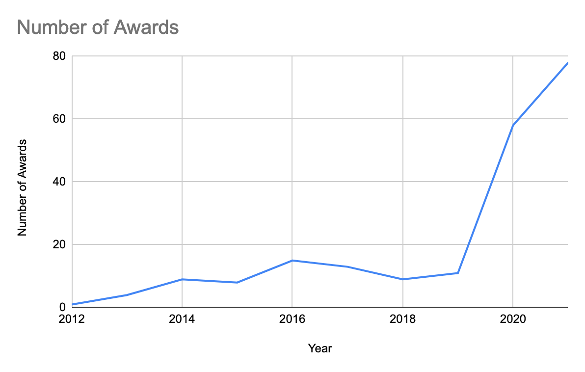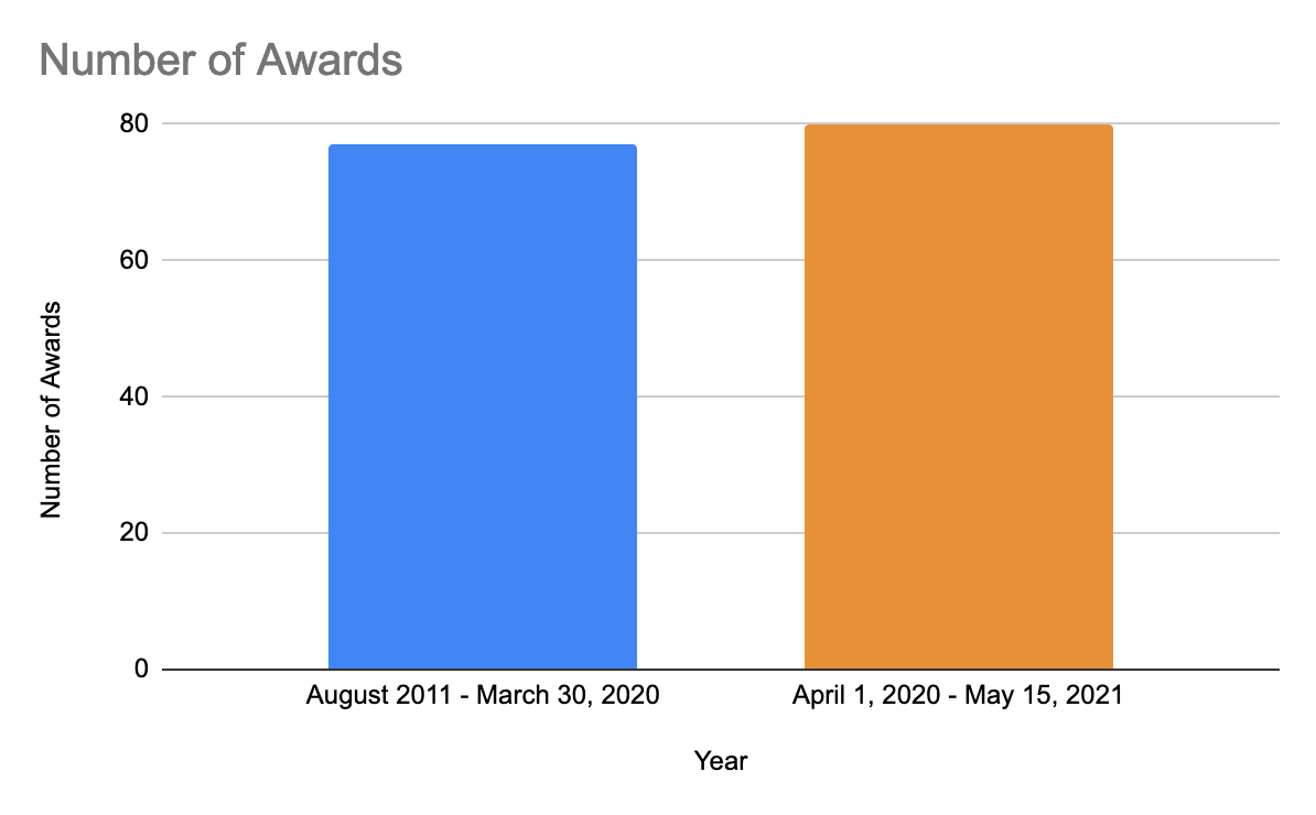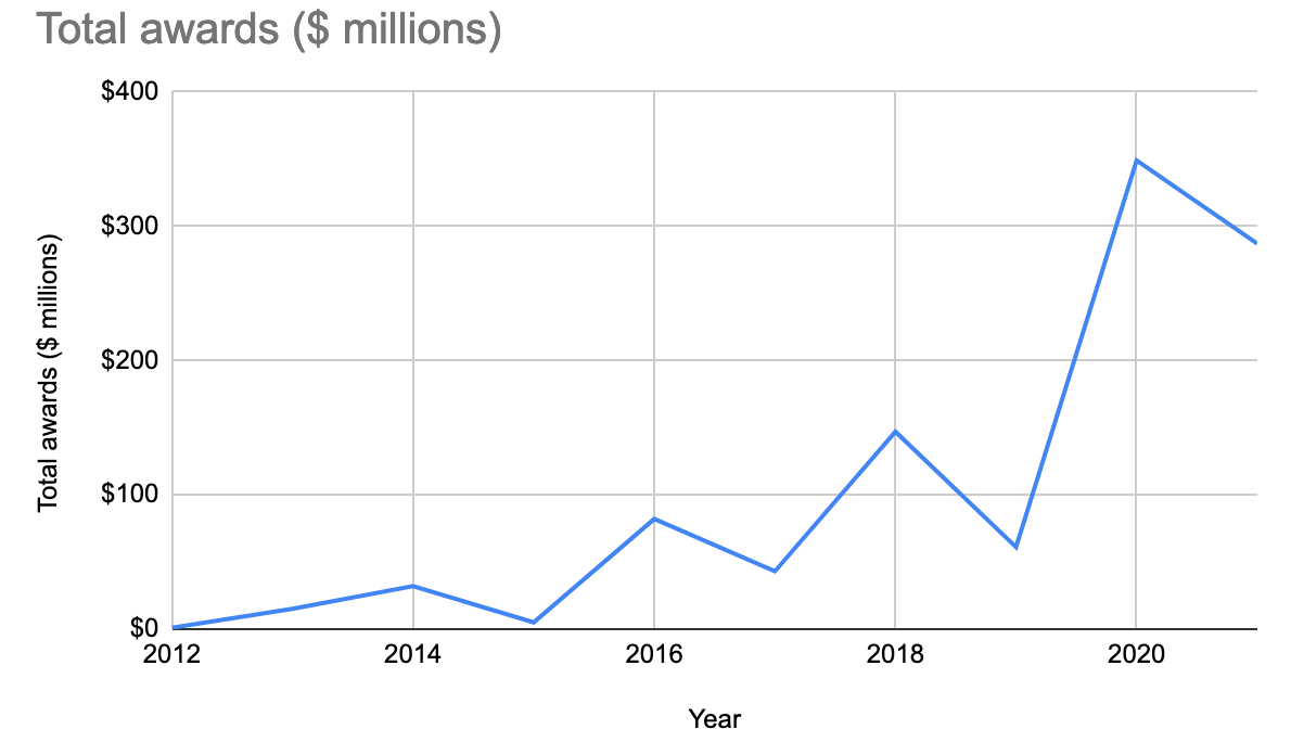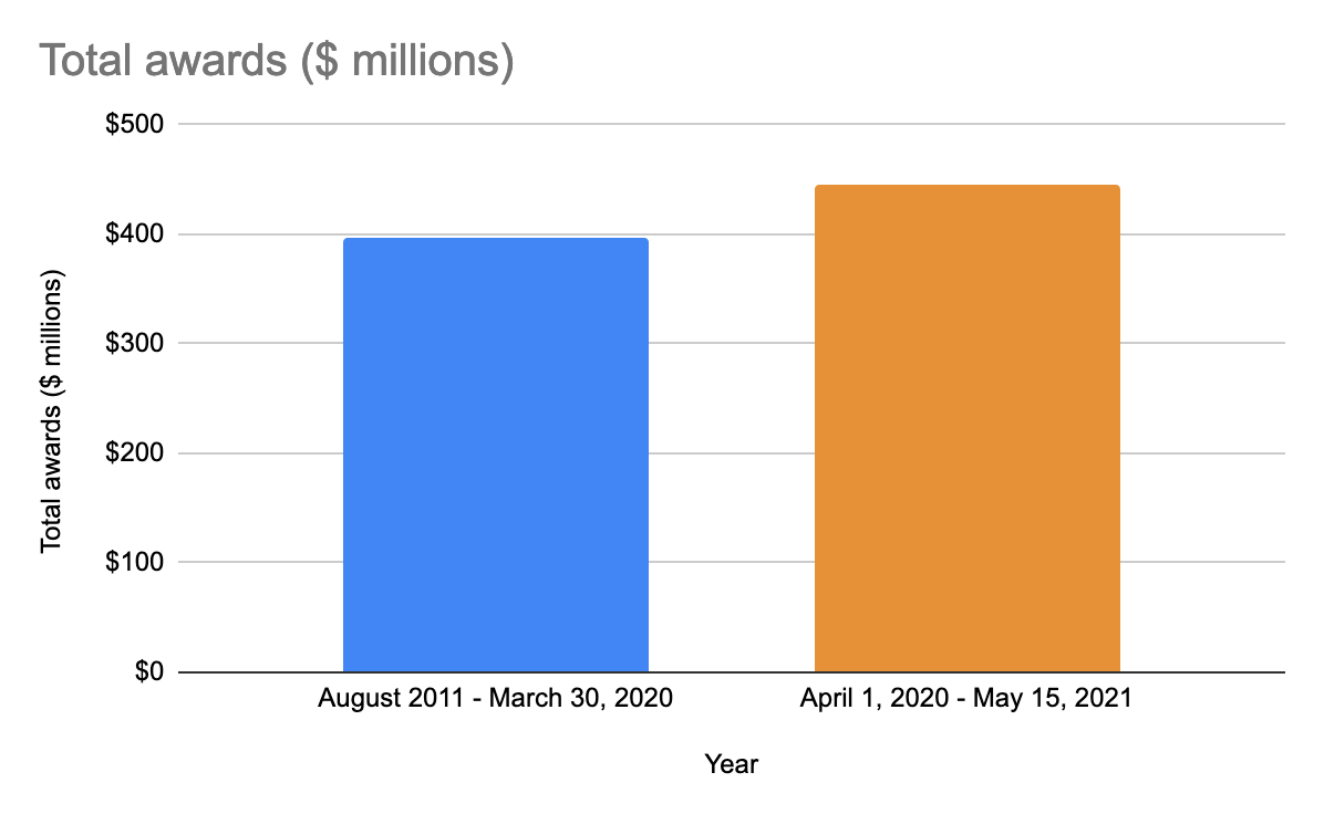 ** Projected out for a full year, the SEC is on pace to issue around 78 awards totaling around $287 million in 2021
