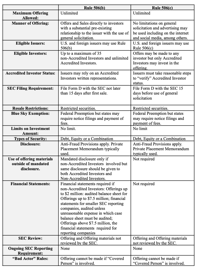 The following chart summarizes the key metrics for the exemptions from registration under SEC Regulation D Rule 506(b) and Regulation D Rule 506(c). Rule 506(b) and Rule 506(c) offerings each have unique requirements which must be strictly complied with. For example, while Rule 506(c) allows general solicitation and advertising, the rule requires that the issuer verify the accredited investor status of each purchaser. To assist with the process of verification, Rule 506(c) accredited investor verification providers have been established.