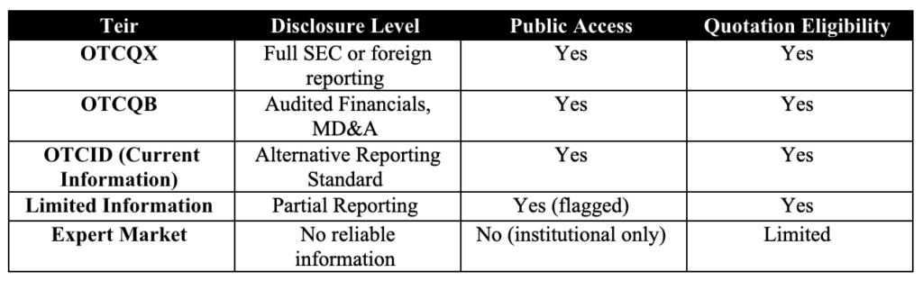 The Expert Market is the lowest OTC Markets tier and serves as a restricted venue for institutional participants. It replaces the former ‘No Information’ category, limiting access to professional investors only.
