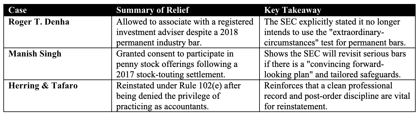 Recent SEC orders suggest a more practical path to relief for individuals seeking reentry after administrative bars, including penny stock bars, and for professionals seeking reinstatement after Rule 102(e) suspensions.