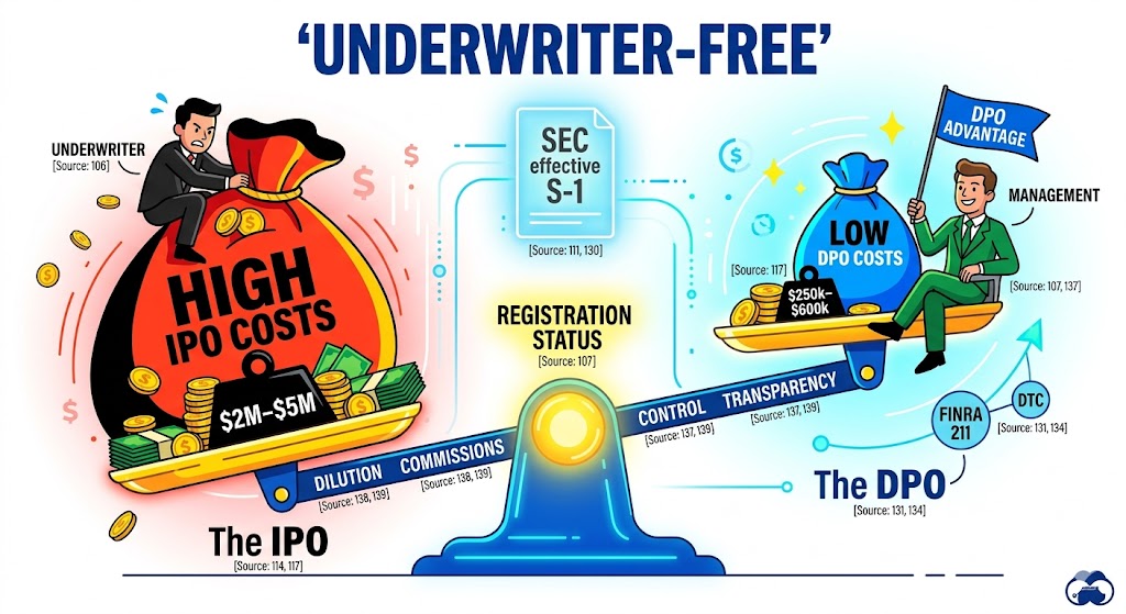 In a traditional IPO, underwriters receive 5%–7% of gross proceeds as commissions plus warrant coverage and reimbursed expenses. By eliminating the underwriter, a DPO avoids these costs entirely, producing savings that can exceed hundreds of thousands or even millions of dollars.